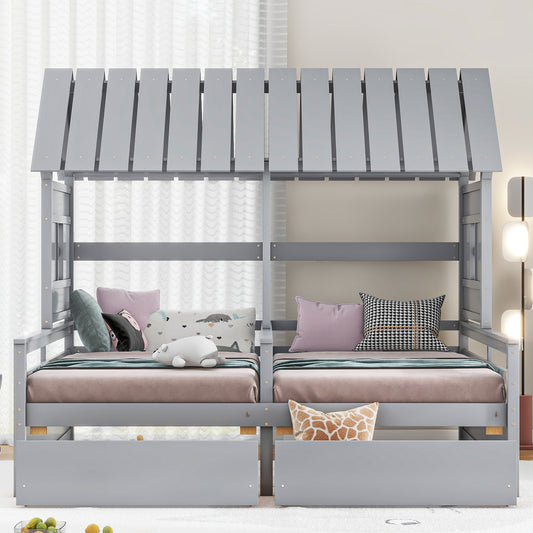 Twin Size House Platform Beds with Two Drawers for Boy and Girl Shared Beds, Combination of 2 Side by Side Twin Size Beds, Gray