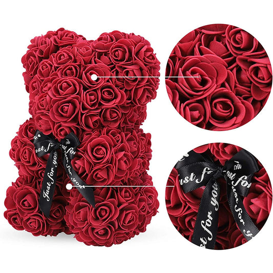 Gifts for Women - Rose Bear - Rose Flower Bear Hand Made Rose Teddy Bear - Gift for Valentines Day; Mothers Day; Wedding and Anniversary & Bridal Showers - w/Clear Clear Gift Box 10 Inch (Red)