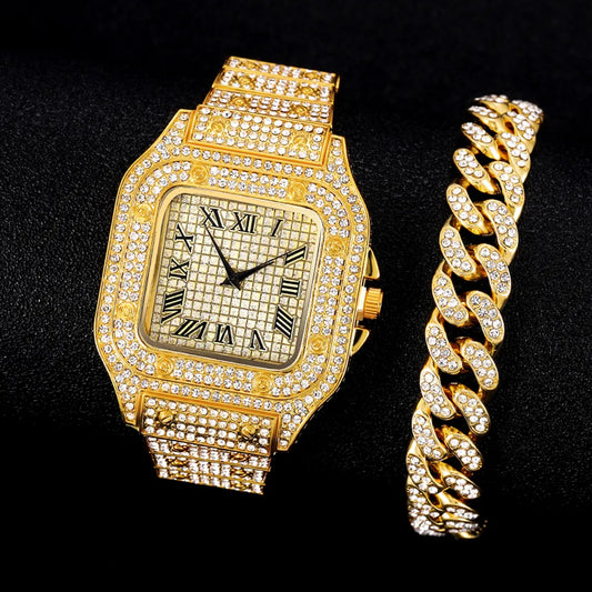Men Watch Luxury Set Full Ice Out Gold Silver Color Watches Fashion Red Dial Quartz Wristwatch Steel Watch For Men