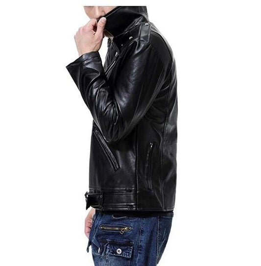 Men's Faux Leather Jacket Black Slim Fit Belted Punk Motorcycle Coat