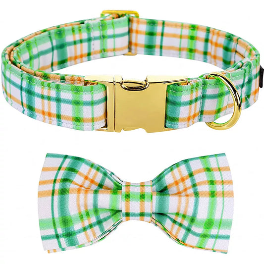 Personalized Unique Style Paws Summer Dog Collar Green Plaid Dog Collar with Bow Cotton Dog Collar for Large Medium Small Dog