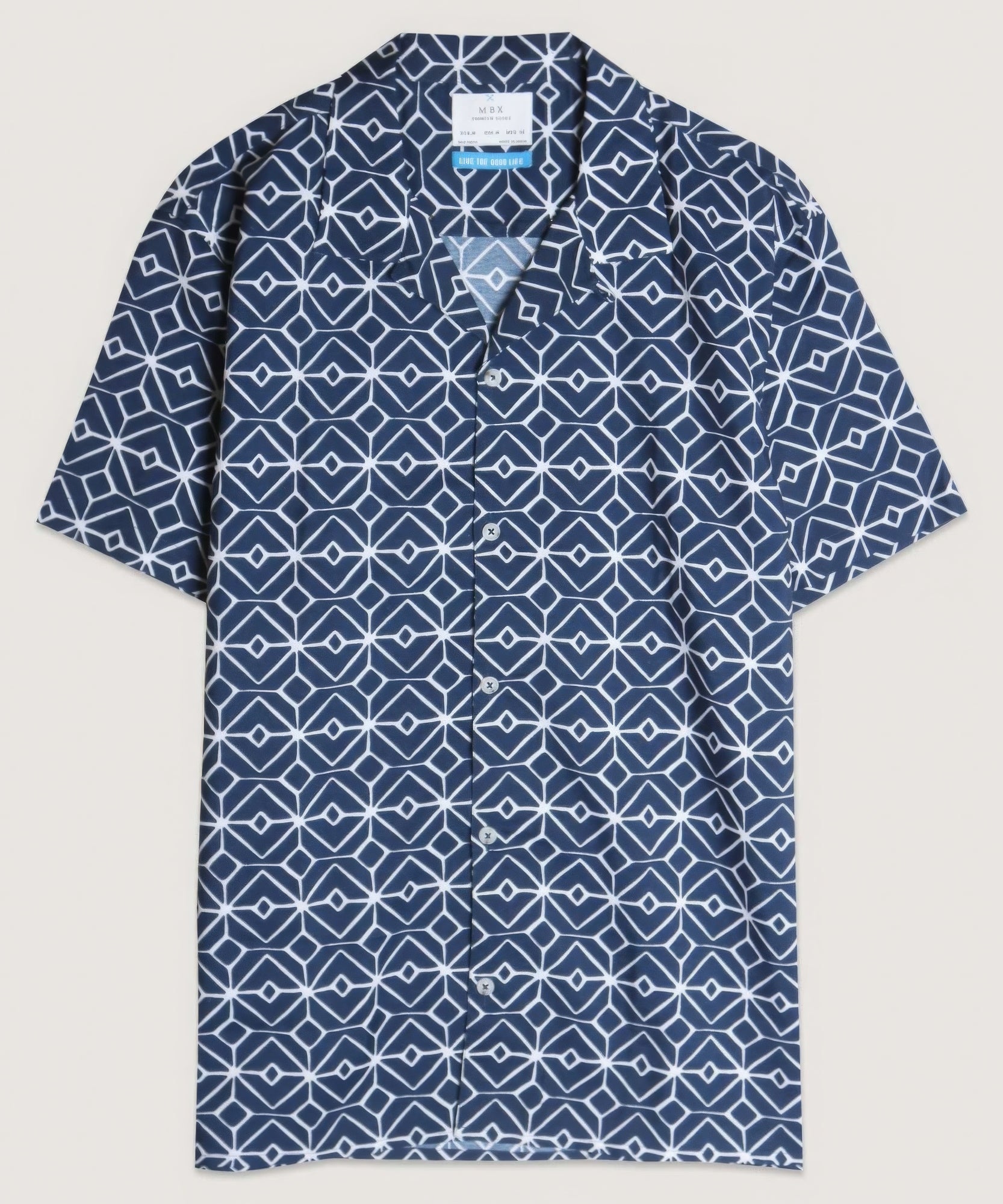 Add a touch of contemporary flair to your wardrobe with our Geo Print Camp Shirt in classic Navy. Shop now and elevate your style with ease!