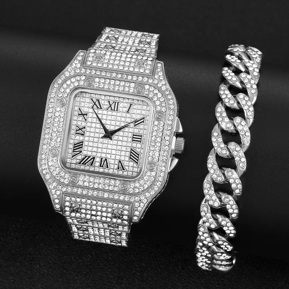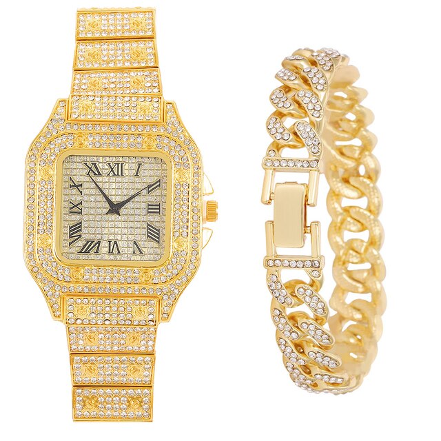 Men Watch Luxury Set Full Ice Out Gold Silver Color Watches Fashion Red Dial Quartz Wristwatch Steel Watch For Men