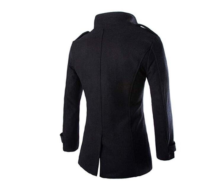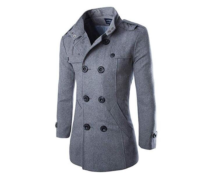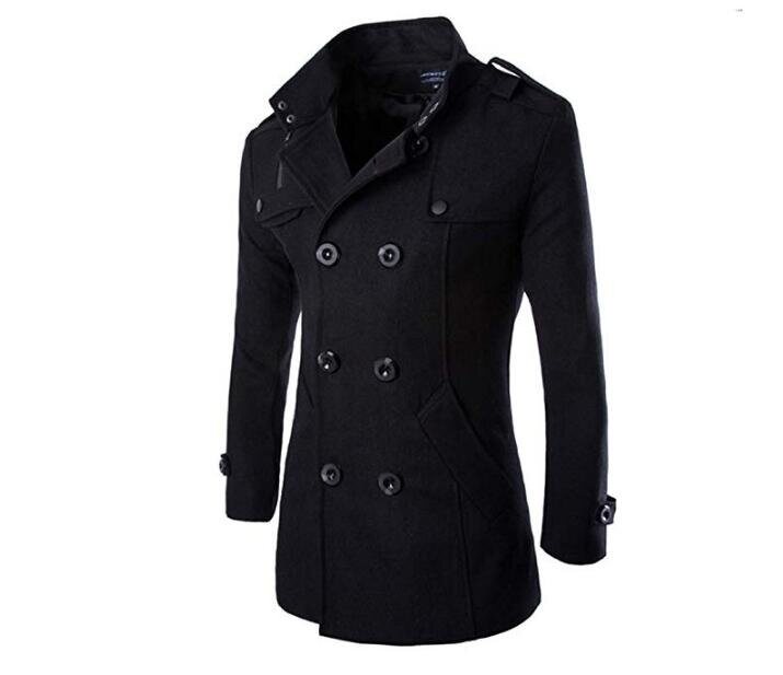 Men's Mid Long Wool Woolen Pea Coat Double Breasted Stand Collar Overcoat Winter Trench Coat
